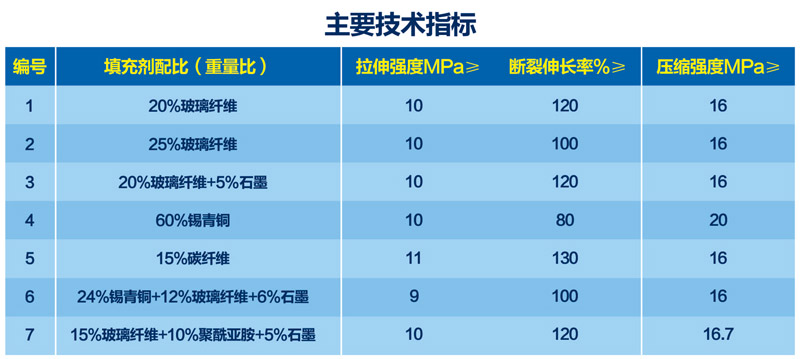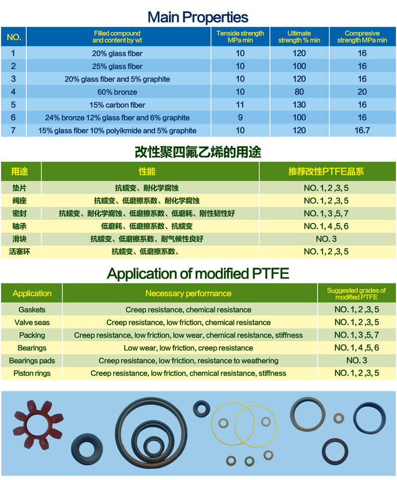 改性聚四氟乙烯制品選用填充聚四氟乙烯樹脂經模壓、車削加工而成。懸浮聚合聚四氟乙烯樹脂與各種填充劑經高速混合得到改性樹脂。適合與聚四氟乙烯混合的填充劑有高目數玻璃纖維、碳纖維、銅粉及潤滑劑(石墨、二硫化鉬等),其已在生產中廣泛應用。同傳統聚四氟乙烯相比具有更高的壓縮強度、耐磨性、導熱性和抗蠕變性等諸多優點。